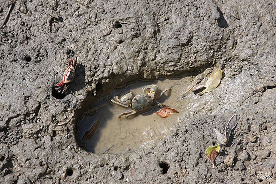 水道沿途的土堤、氣根與泥灘之間,隨處可見招潮蟹、和尚蟹